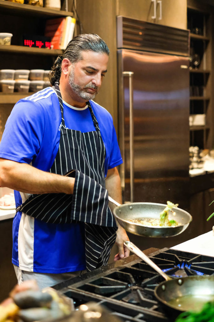 “Sweetbreads are a 24-hour process item, just so you know.” Chef Alvarez leans into the microphone to give the judges a heads up. “You poach it, and then you press it overnight and clean the membrane off of it.”